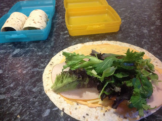Our lunches right now consist of wholegrain wraps (from Aldi) topped with Chipotle aioli (from Costco), grated cheese, sliced chicken and mixed salad leaves. They get rolled, chopped in half and boxed in Tupperware sandwiches boxes. I have a stack of these and the kids have two colours each to claim as theirs. They know which one to pick up when they pack their bags. I put the grated cheese directly on whatever the mayo is at the time, because the cheese sticks and doesn't fall out. It was a whole thing! Cheese falling out just doesn't work that great.